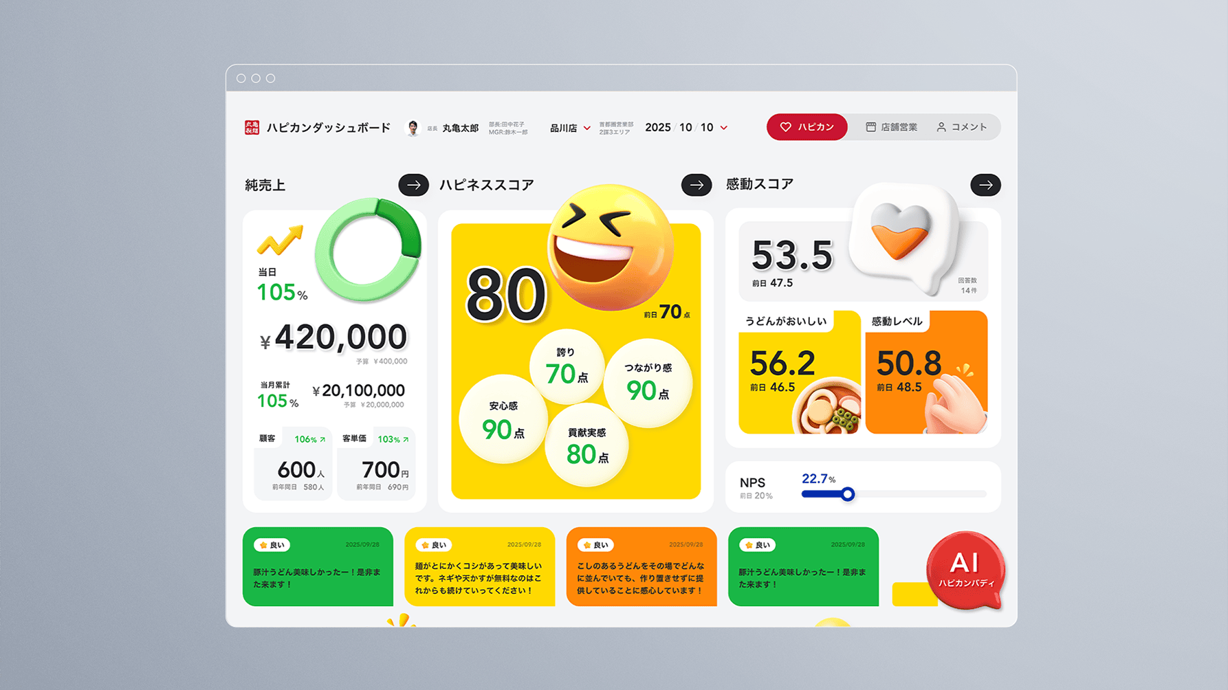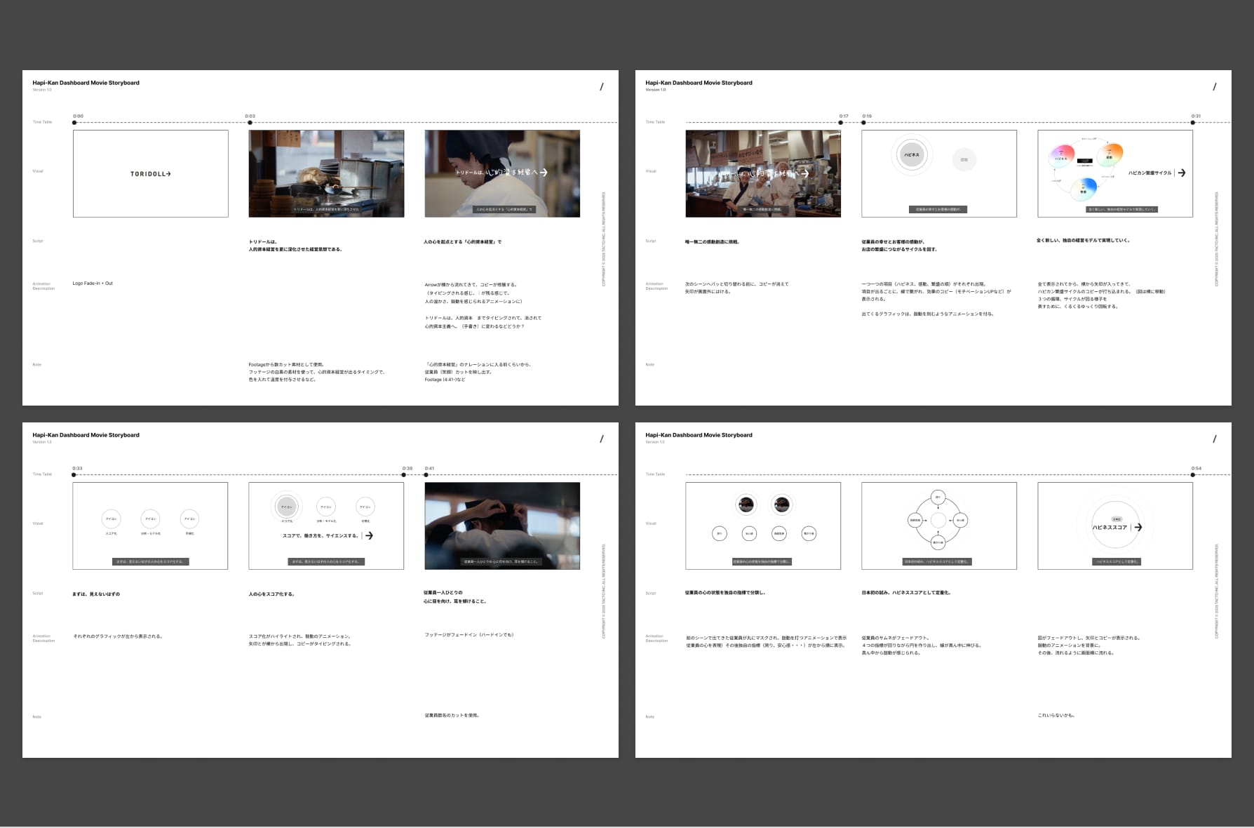 トリドールが目指す「心的資本経営」と、独自のモデルである「ハピカン繁盛サイクル」を紐解き、それらを可視化して従業員へ届けるダッシュボードのコンセプトを映像化しました。ダッシュボードのデザインカンプ開発、スクリプトライティング、映像編集を同時進行で進め、UI/UXを初期段階から高い解像度で具体化。その結果、今回の取り組みがどのように具現化されていくのかをわかりやすく示すムービーとして仕上げることができました。